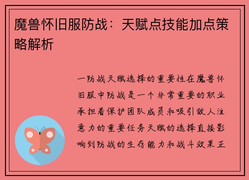 魔兽世界怀旧服战士如何带技能 一、选择合适的天赋 在魔兽世界怀旧服中,战士是一个非常强大的职业,但是技能的选择和天赋的分配将直接影响战士的战斗能力。我们需要根据自己的游戏风格和战斗需求选择合适的天赋。比如,如果你更喜欢近战输出,可以选择狂怒天赋,而如果你更倾向于坦克角色,可以选择防护天赋。k8凯发官网网&#x...